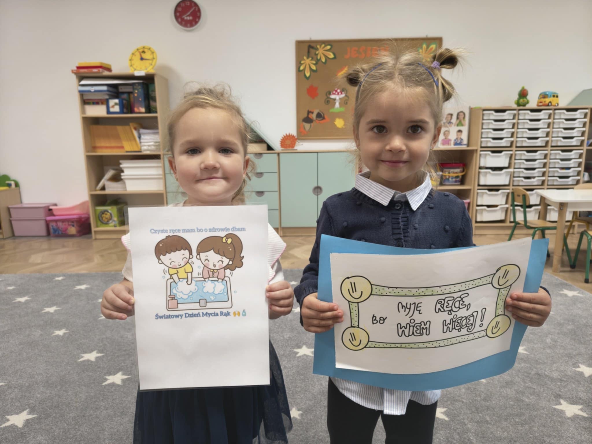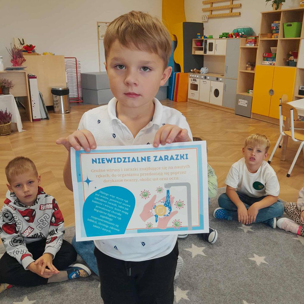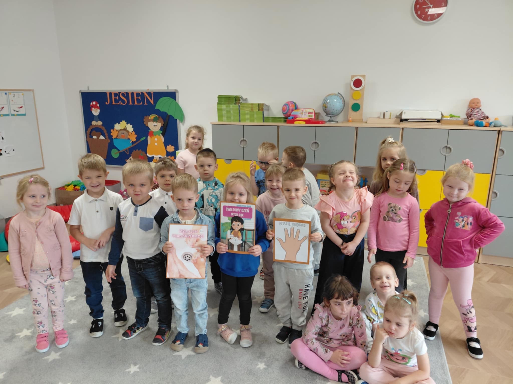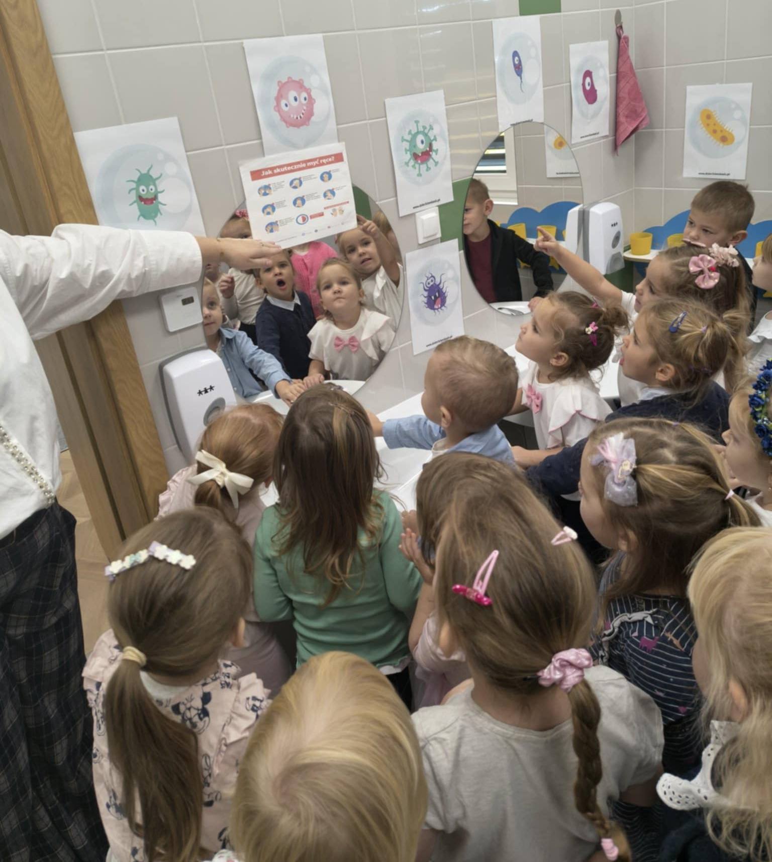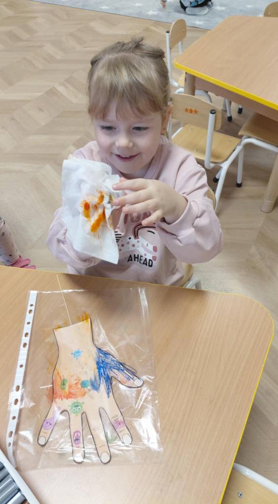 Światowy Dzień Mycia Rąk, który obchodzimy 15 października jest okazją do przypomnienia o znaczeniu higieny. W związku z tym we wszystkich grupach odbyły się rozmowy na temat zarazków, bakterii i wirusów, które dostają się do organizmu przez brudne ręce. Wszystkie zajęcia i zabawy w dniu dzisiejszym koncentrowały się na myciu rąk i miały charakter działań dzieci.